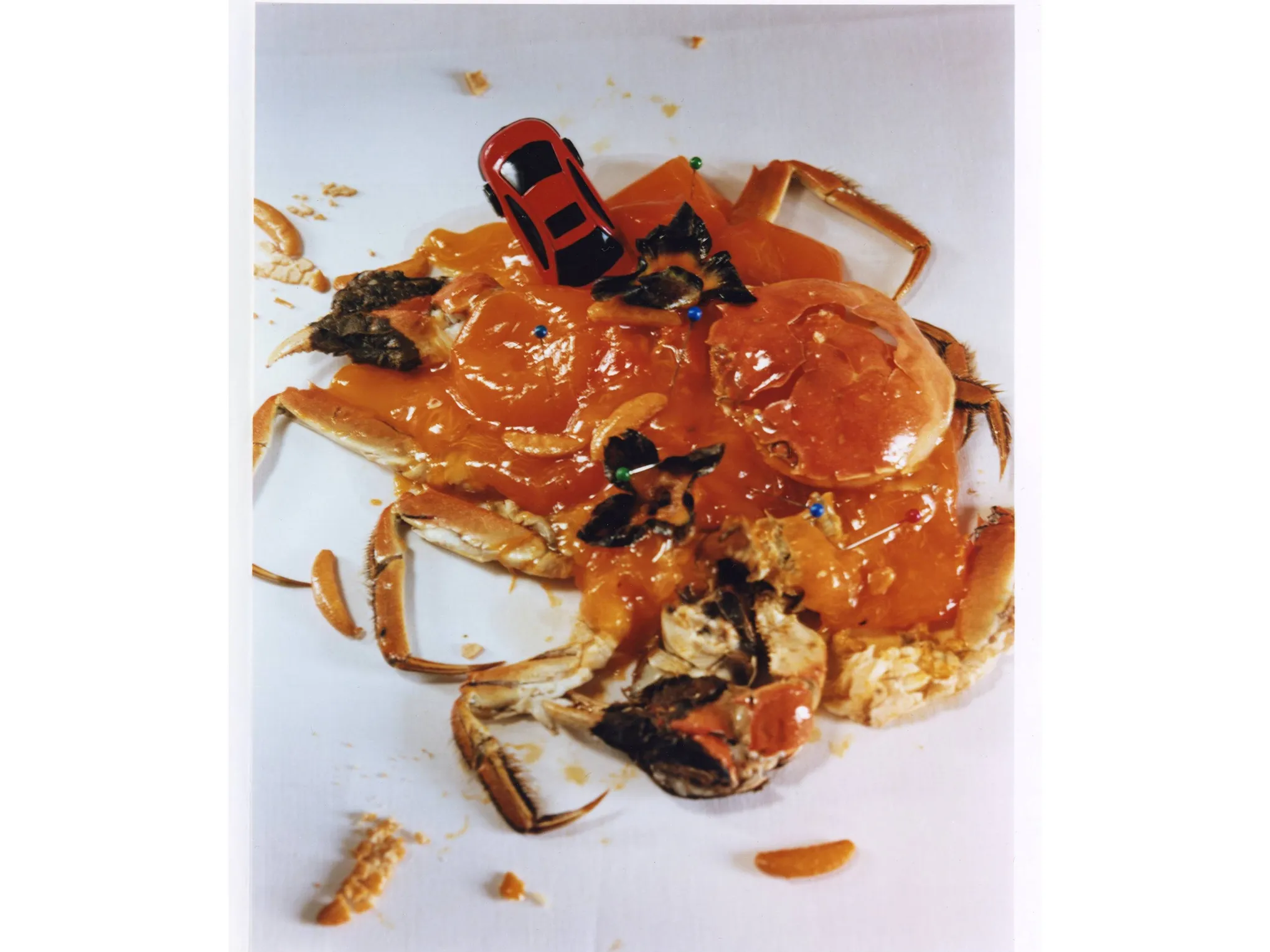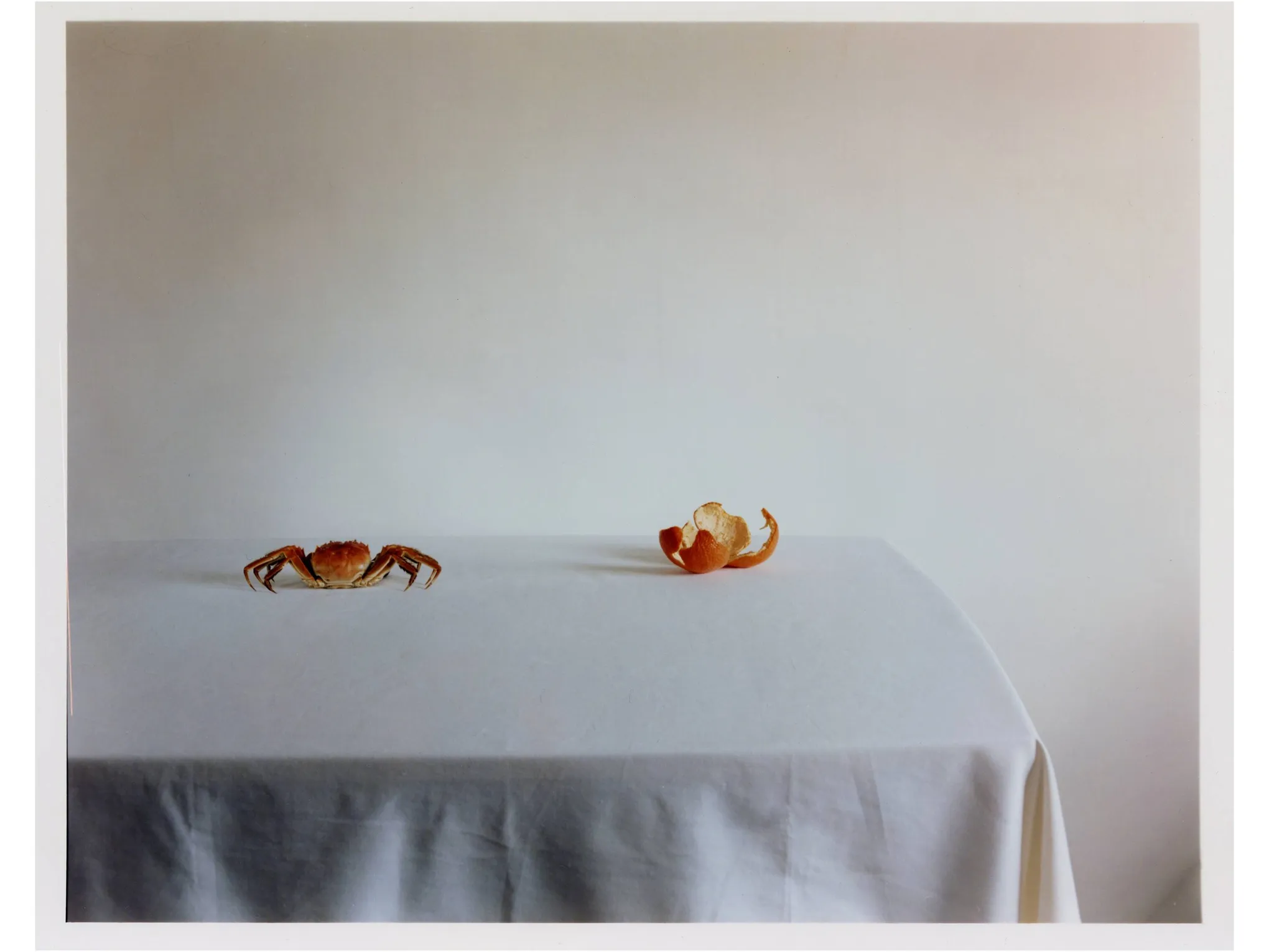 收到這次拍攝邀約以「食欲之秋」為創作主題,我第一個想到的是電視節目的主持人總會在秋天到來時宣布:「吃大閘蟹的季節又來了!」小時候媽媽的床頭放著一本與食物有關的書,書的背面印有多種食物插圖,標示出相剋的食材,以及它們會帶來的副作用。其中一幅螃蟹和柿子的圖案令我印象特別深刻,當我詢問媽媽時,她總會皺起眉頭告誡我,同時吃下螃蟹與柿子的毒會有如吃下毒蛇那麼致命。或許是因為這份警告的重量,一提起秋天的食物,我反而第一個就聯想起大閘蟹,這些元素也因而成為本次拍攝的主軸。